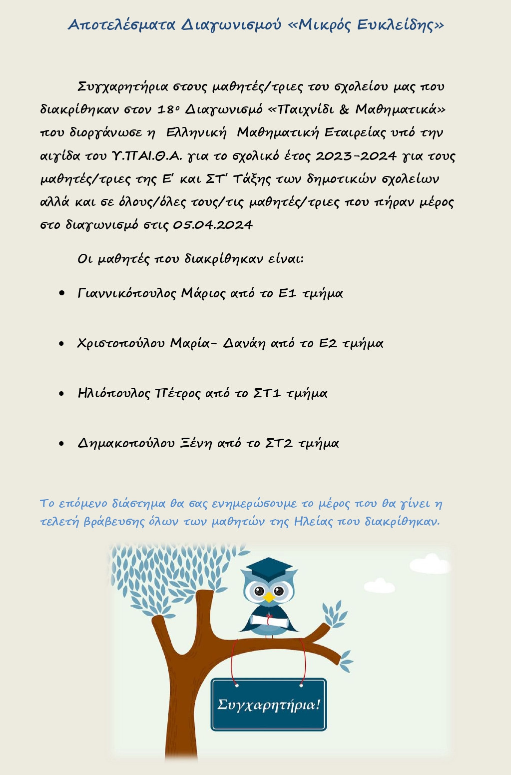 Αποτελέσματα Διαγωνισμού "Μικρός Ευκλείδης"