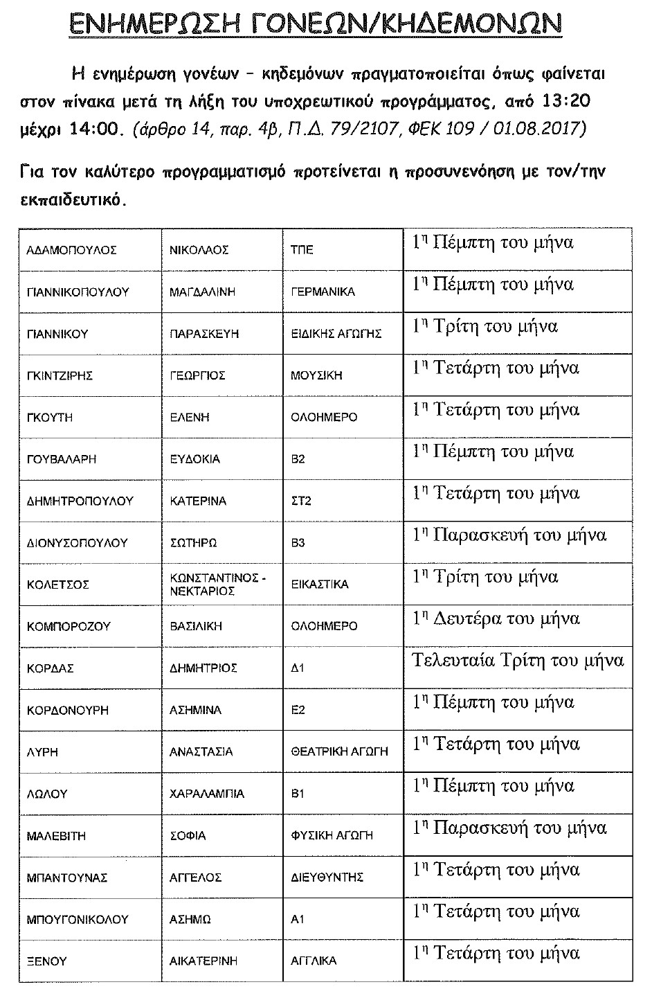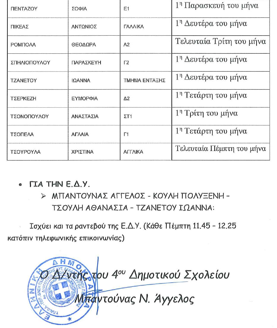 Ώρες υποδοχής για ενημέρωση γονέων